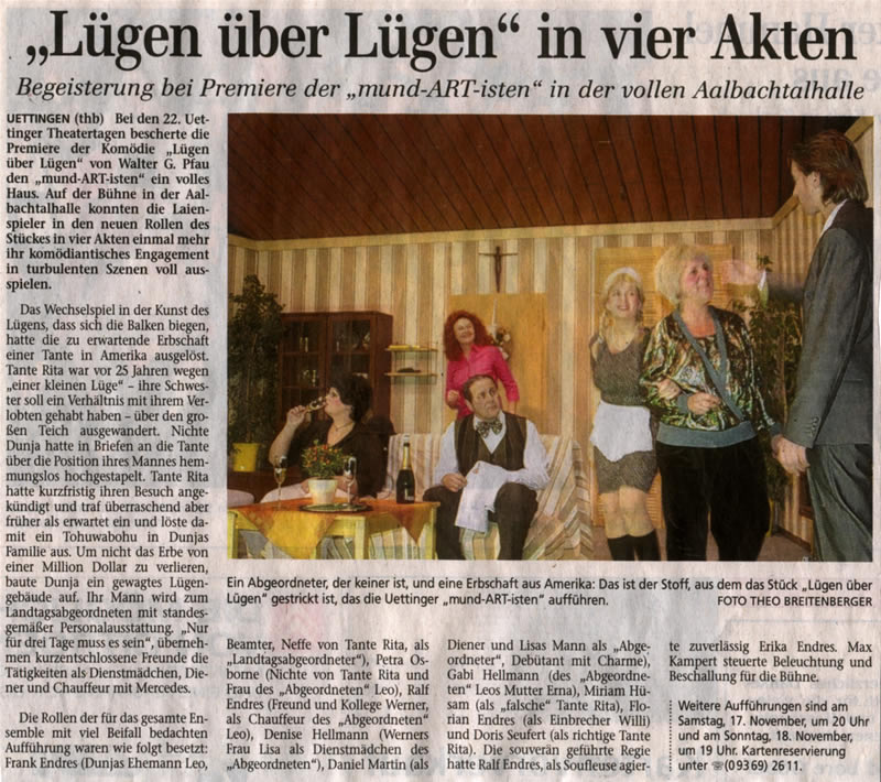 Lügen über Lügen auf zwei Stunden verteilt, die dem Publikum beste Unterhaltung boten. Doch halt! Ist Tante Rita auch wirklich die Erbtante aus Amerika?